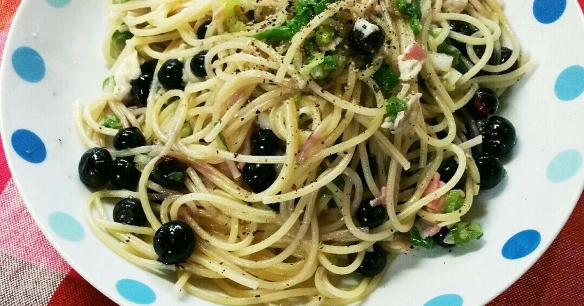 ネギとチーズ、ブルーベリーのオイルパスタ
